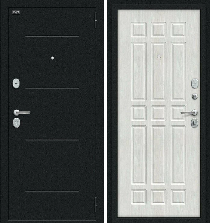 Надежная входная Дверь Браво Мило Букле черное/Bianco Veralinga премиум класса по цене 30 037 руб. Большая толщина стали защитит от проникновения в ваш дом, квартиру или коттедж. Используется очень качественная фурнитура: замки, цилиндры, ручки, защелки. Покрытие и отделка двери изготовлено под внимательным контролем производителя. Дверь имеет долгий срок службы и гарантию.